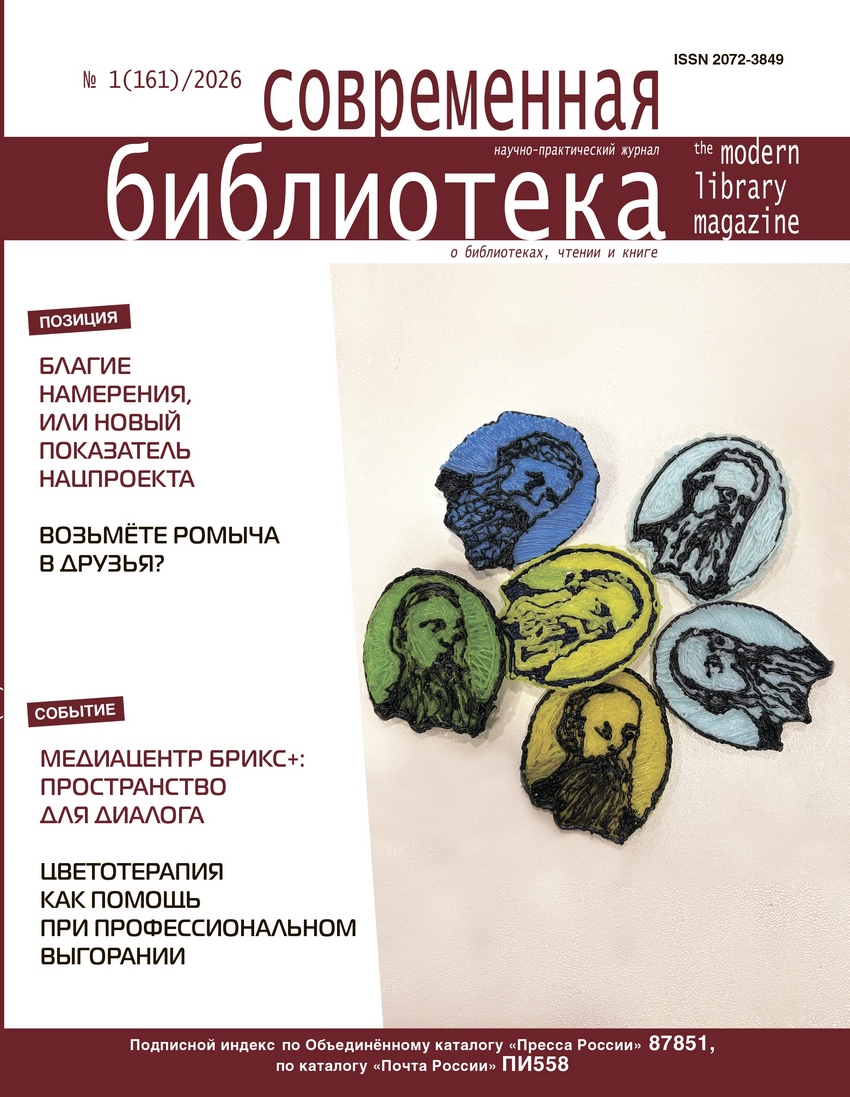 Журнал «Современная библиотека» - журнал о библиотеках, чтении, книгах. Научно-практический журнал об актуальных проблемах развития библиотечно-информационных и образовательных учреждений, внедрении современных информационных телекоммуникационных технологий в библиотеках, школах, информационных и культурных центрах, о чтении, книгах и людях профессии.